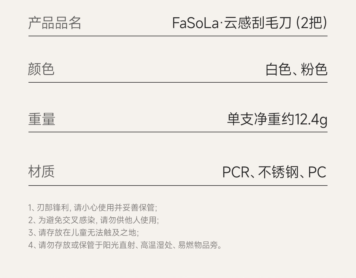 | 商品材质:手柄、连接键材质:环保PCR、刀片(420不锈钢2层刀片,单层厚度约0.11mm)、保护盖:PC、润滑条(聚乙二醇、聚苯乙烯、硬脂酸、甘油、羧甲基纤维素、碳酸钙、芦芸精华) |